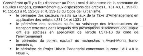 - servitudes d’utilité publique - liste des lotissements - schémas des réseaux d’eau et d’assainissement - plans d’exposition au bruit des aérodromes - secteurs sauvegardés, ZAC, etc.